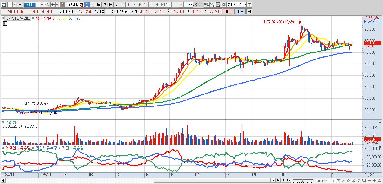 - 두산에너빌리티 (78,000원 ▲ 0.78% , 시총: 499,638억, 거래량: 4,089,864, 거래대금:3,222억)