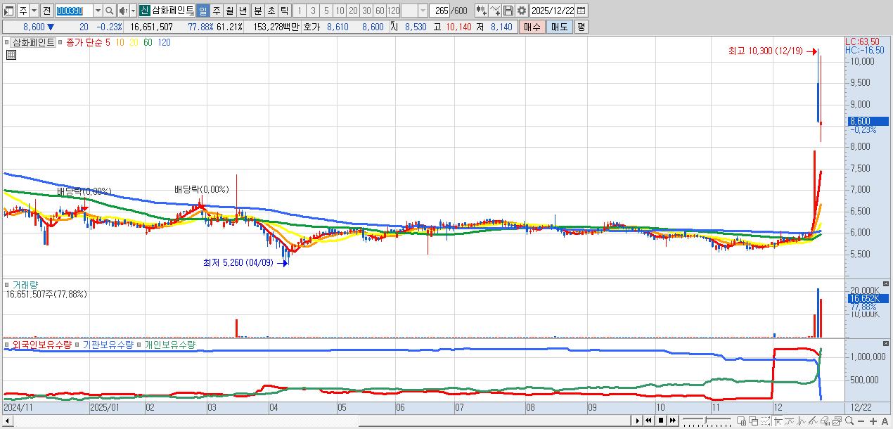- 삼화페인트 (8,600원 ▼ -0.23% , 시총: 2,339억, 거래량: 16,651,507, 거래대금:1,533억)
