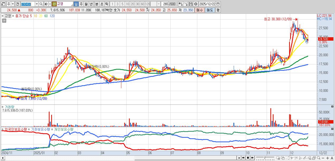 - 고영 (24,500원 ▲ 3.38% , 시총: 16,820억, 거래량: 7,615,936, 거래대금:1,882억)