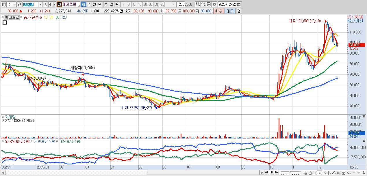 - 에코프로 (98,000원 ▲ 1.24% , 시총: 133,061억, 거래량: 2,277,043, 거래대금:2,234억)