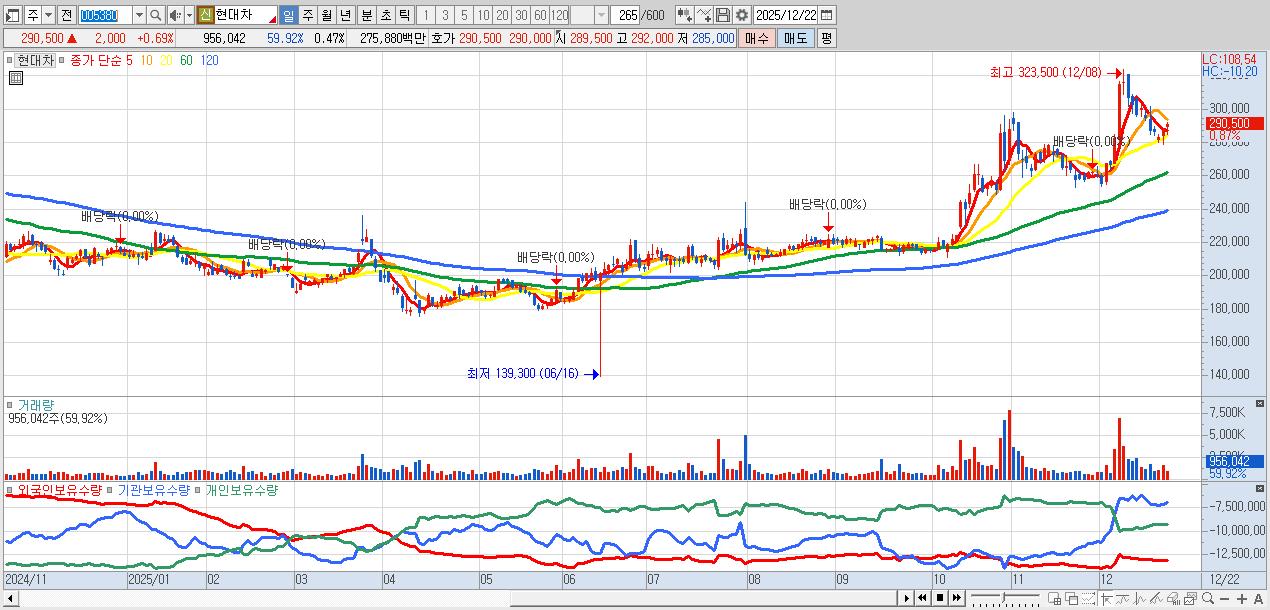 - 현대차 (289,000원 ▲ 0.17% , 시총: 591,750억, 거래량: 676,748, 거래대금:1,951억)