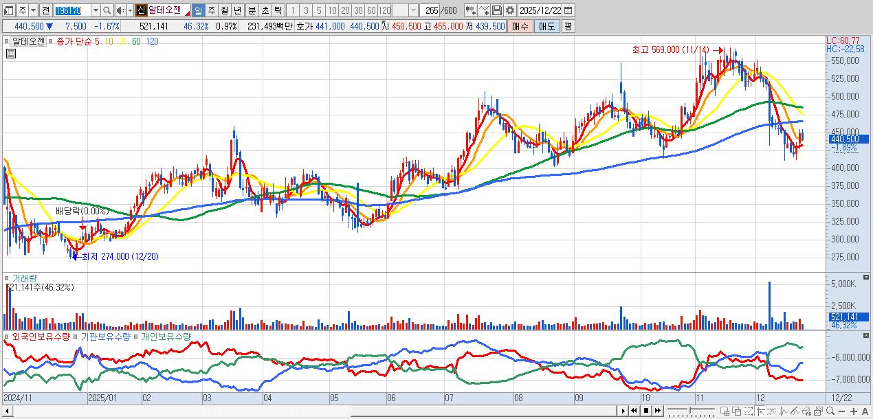 - 알테오젠 (439,500원 ▼ -1.9% , 시총: 235,158억, 거래량: 336,831, 거래대금:1,494억)