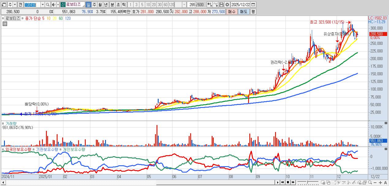 - 로보티즈 (280,500원 0% , 시총: 40,869억, 거래량: 551,863, 거래대금:1,555억)
