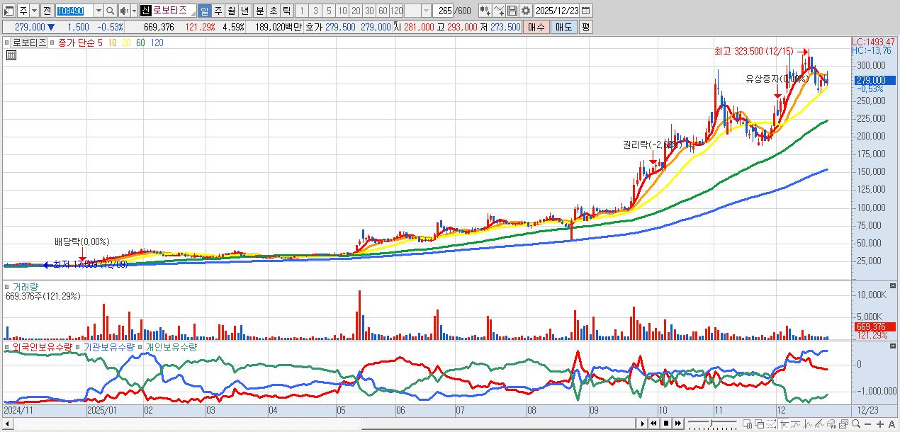 - 로보티즈 (279,000원 ▼ -0.53% , 시총: 40,651억, 거래량: 669,376, 거래대금:1,890억)