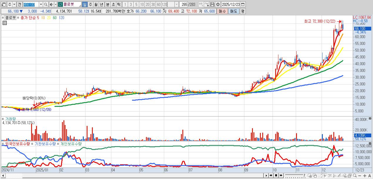 - 클로봇 (66,100원 ▼ -4.34% , 시총: 16,520억, 거래량: 4,134,701, 거래대금:2,818억)