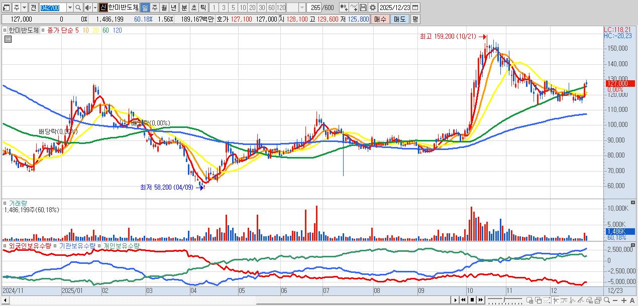 - 한미반도체 (127,000원 0% , 시총: 121,046억, 거래량: 1,486,199, 거래대금:1,892억)