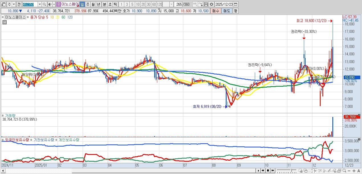 - 이노스페이스 (10,710원 ▼ -28.6% , 시총: 2,209억, 거래량: 19,823,221, 거래대금:2,439억)