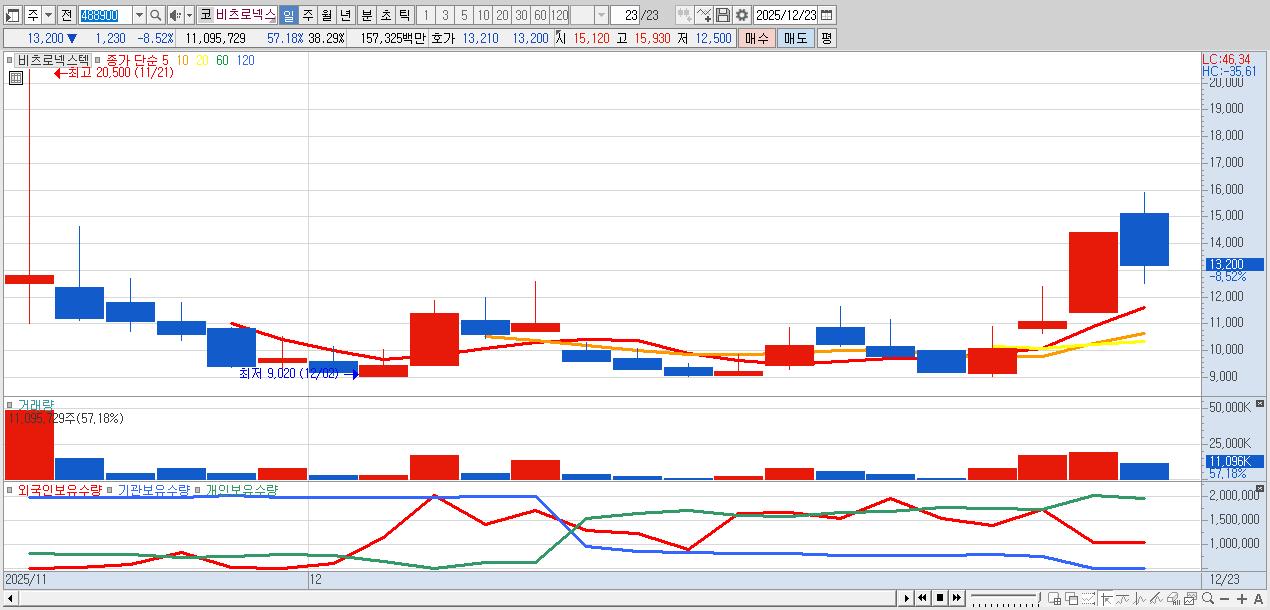 - 비츠로넥스텍 (13,200원 ▼ -8.52% , 시총: 3,825억, 거래량: 11,095,729, 거래대금:1,573억)
