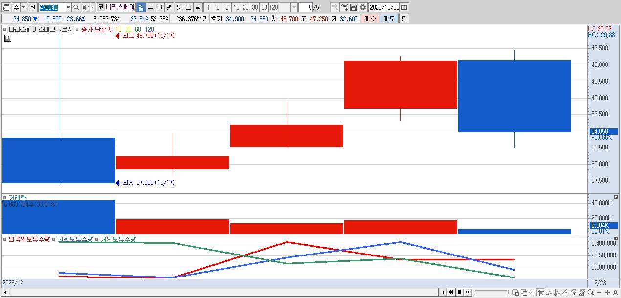 - 나라스페이스테크놀로지 (34,850원 ▼ -23.66% , 시총: 4,019억, 거래량: 6,083,734, 거래대금:2,364억)