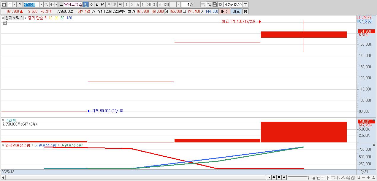- 알지노믹스 (161,700원 ▲ 6.31% , 시총: 22,243억, 거래량: 7,950,082, 거래대금:12,612억)