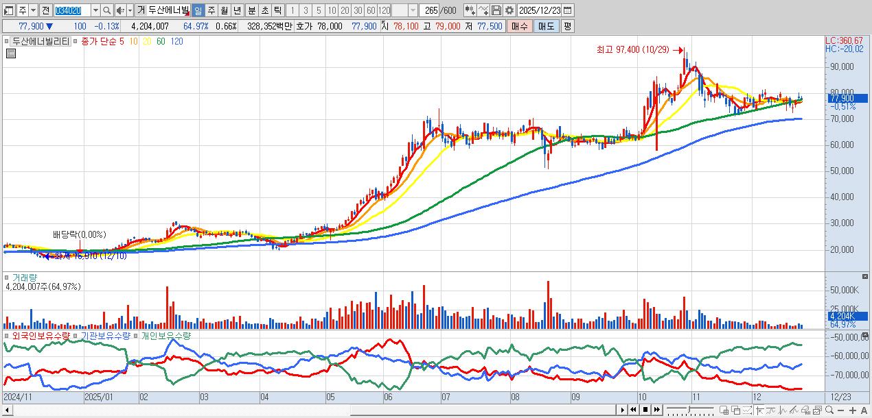 - 두산에너빌리티 (77,600원 ▼ -0.51% , 시총: 497,075억, 거래량: 2,742,514, 거래대금:2,141억)