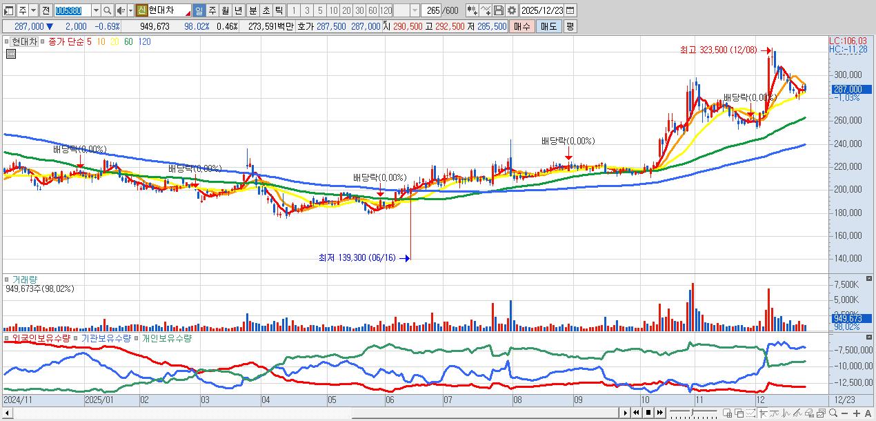 - 현대차 (287,000원 ▼ -0.69% , 시총: 587,655억, 거래량: 699,584, 거래대금:2,014억)
