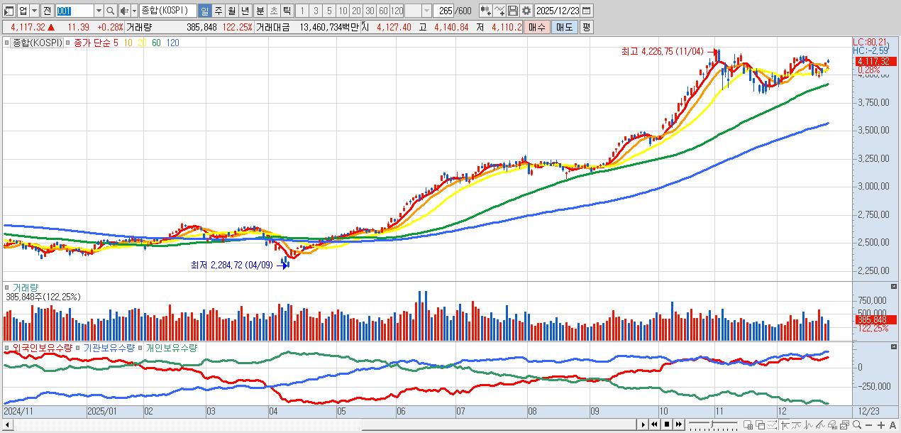 | 12/23 | 4,117.32 | ▲0.28% | -12,853억 | 9,551억 | 3,527억 | -225억 |