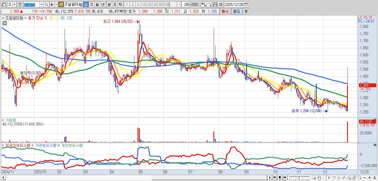 - 조일알미늄 (1,389원 ▲ 14.79% , 시총: 1,759억, 거래량: 46,112,379, 거래대금:665억)
