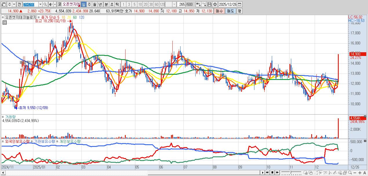 - 오픈엣지테크놀로지 (14,760원 ▲ 22.59% , 시총: 3,256억, 거래량: 2,449,796, 거래대금:342억)