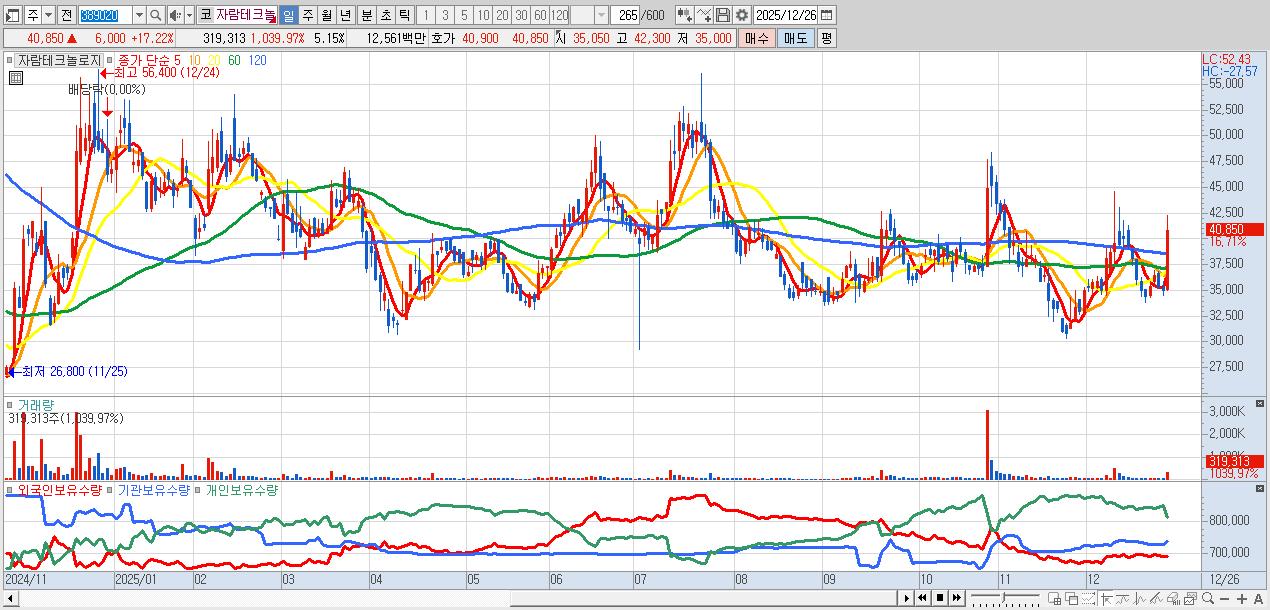 - 자람테크놀로지 (39,050원 ▲ 12.05% , 시총: 2,420억, 거래량: 117,475, 거래대금:45억)