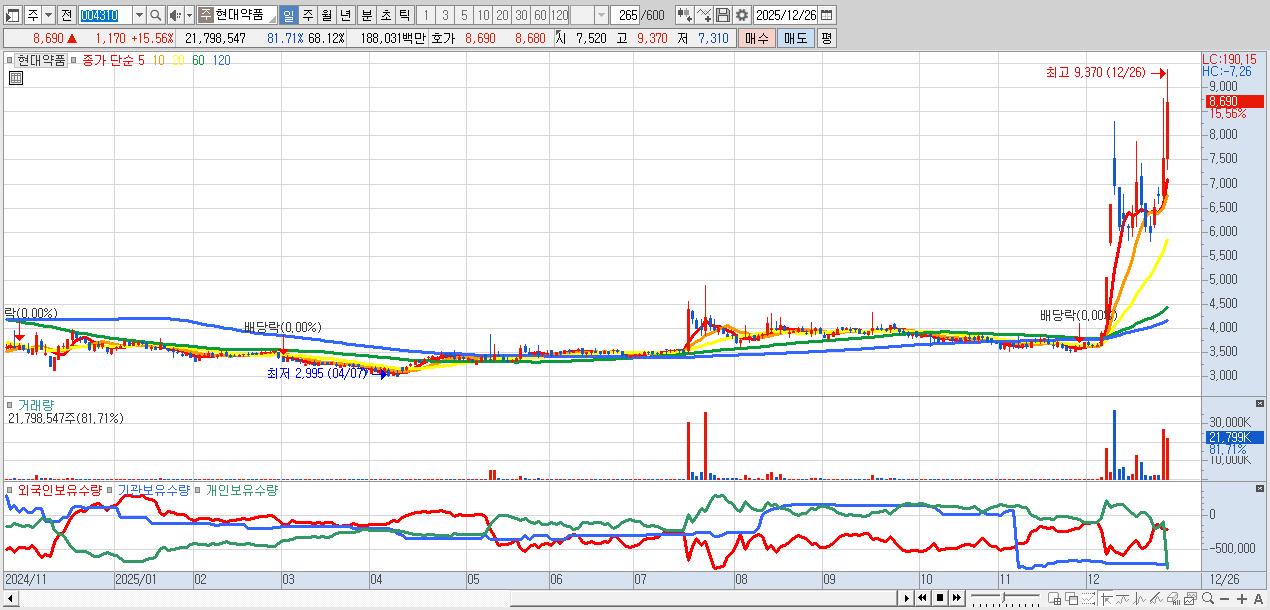 - 현대약품 (8,690원 ▲ 15.56% , 시총: 2,781억, 거래량: 21,798,547, 거래대금:1,880억)