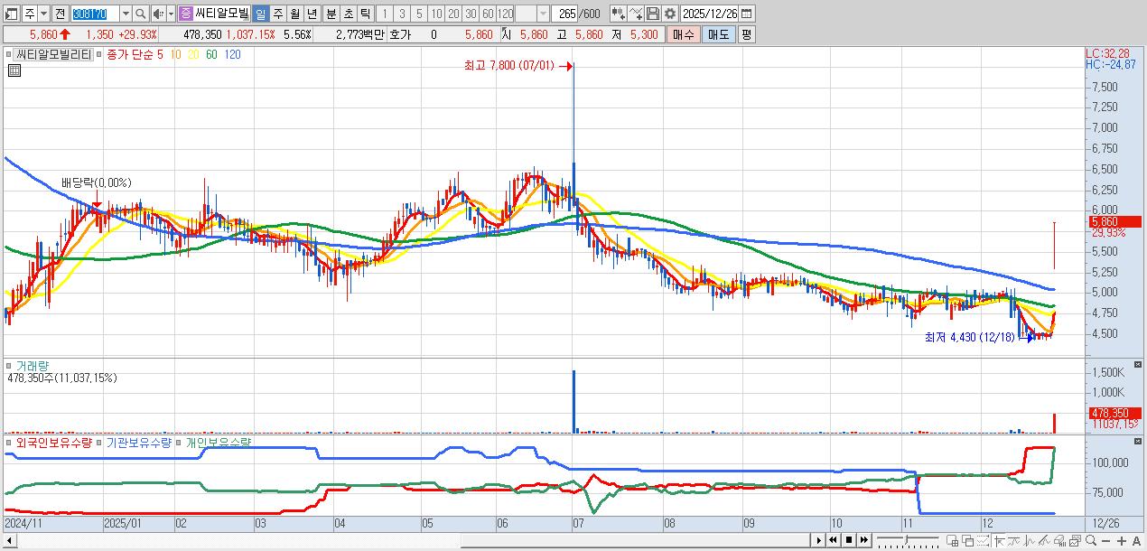 - 씨티알모빌리티 (5,860원 ▲ 29.93% , 시총: 505억, 거래량: 478,350, 거래대금:28억)