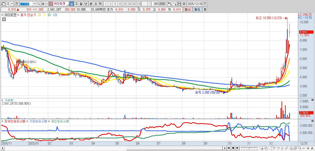 - 싸이토젠 (8,910원 ▲ 11.38% , 시총: 2,061억, 거래량: 2,541,247, 거래대금:230억)
