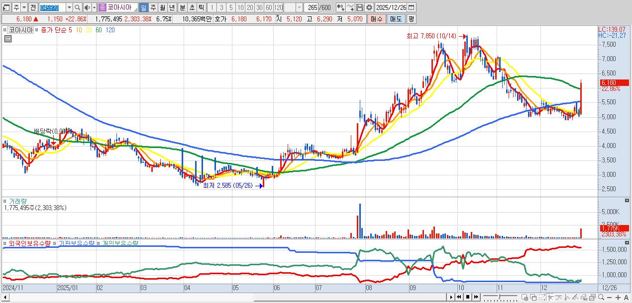 - 코아시아 (6,180원 ▲ 22.86% , 시총: 1,626억, 거래량: 1,775,495, 거래대금:104억)