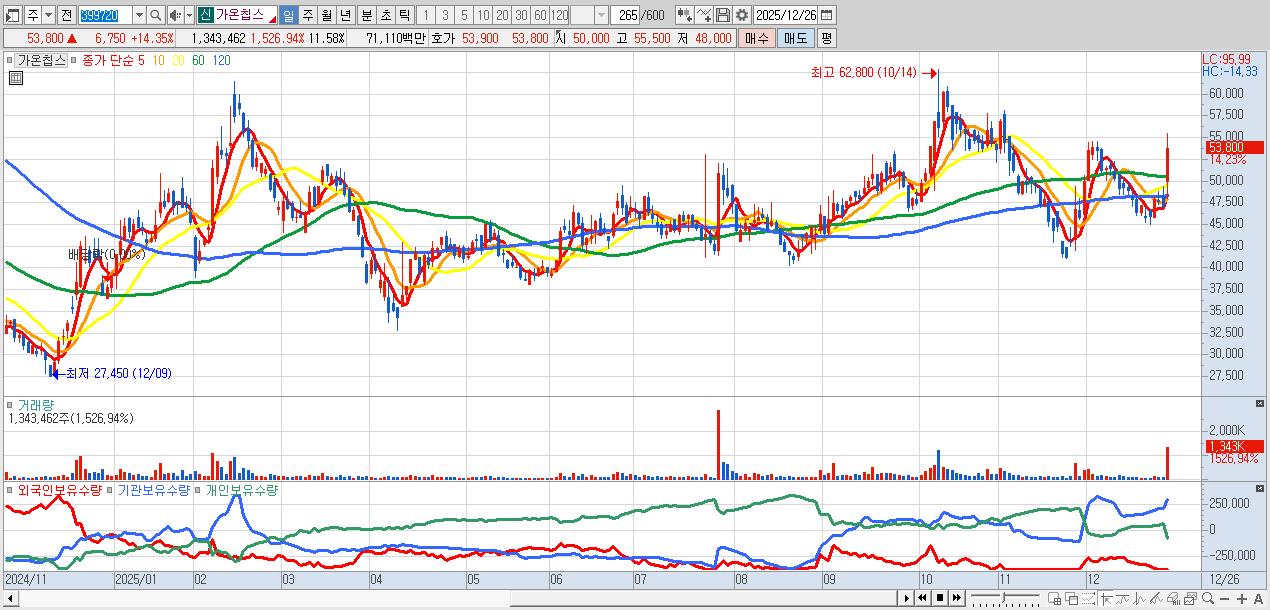 - 가온칩스 (55,000원 ▲ 16.9% , 시총: 6,380억, 거래량: 739,559, 거래대금:392억)
