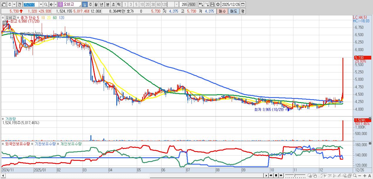 - 오비고 (5,730원 ▲ 29.93% , 시총: 724억, 거래량: 1,524,155, 거래대금:84억)