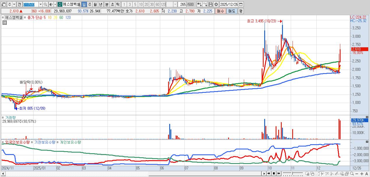 - 에스엠벡셀 (2,610원 ▲ 16% , 시총: 2,904억, 거래량: 29,969,697, 거래대금:775억)