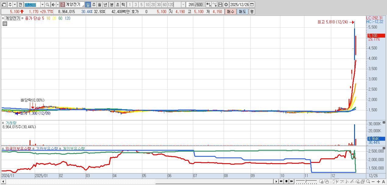 - 계양전기 (5,100원 ▲ 29.77% , 시총: 1,388억, 거래량: 8,964,015, 거래대금:424억)