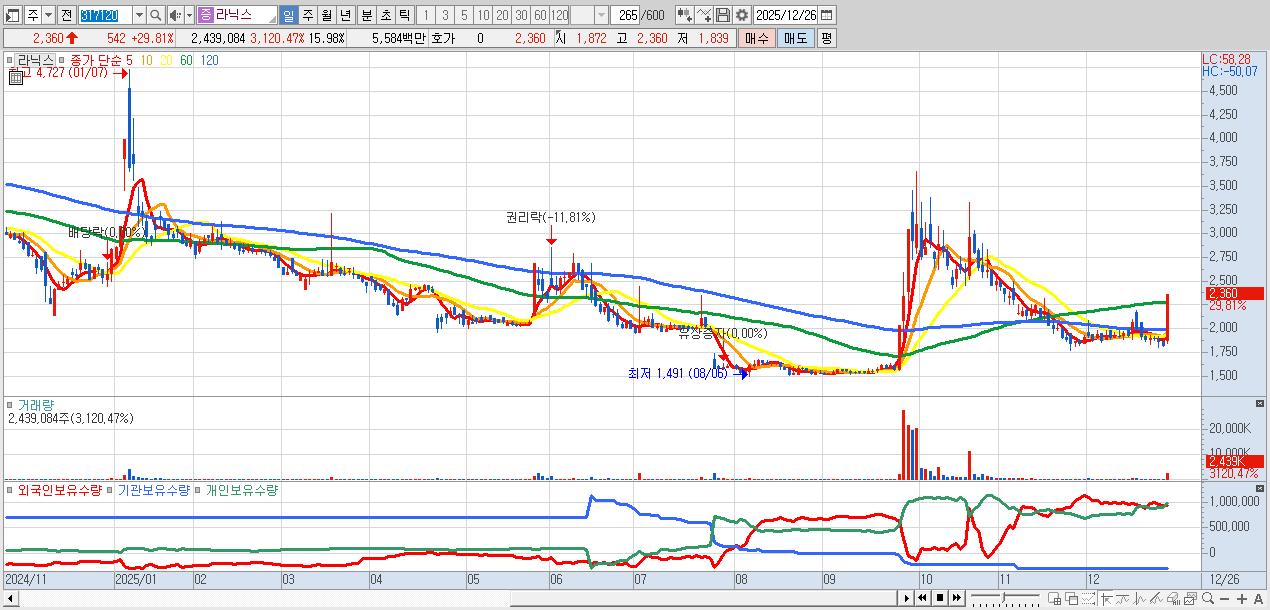 - 라닉스 (2,360원 ▲ 29.81% , 시총: 360억, 거래량: 2,439,084, 거래대금:56억)
