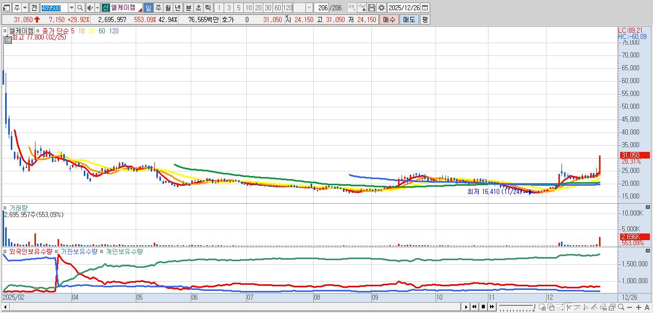 - 엘케이켐 (31,050원 ▲ 29.92% , 시총: 1,949억, 거래량: 1,067,194, 거래대금:307억)