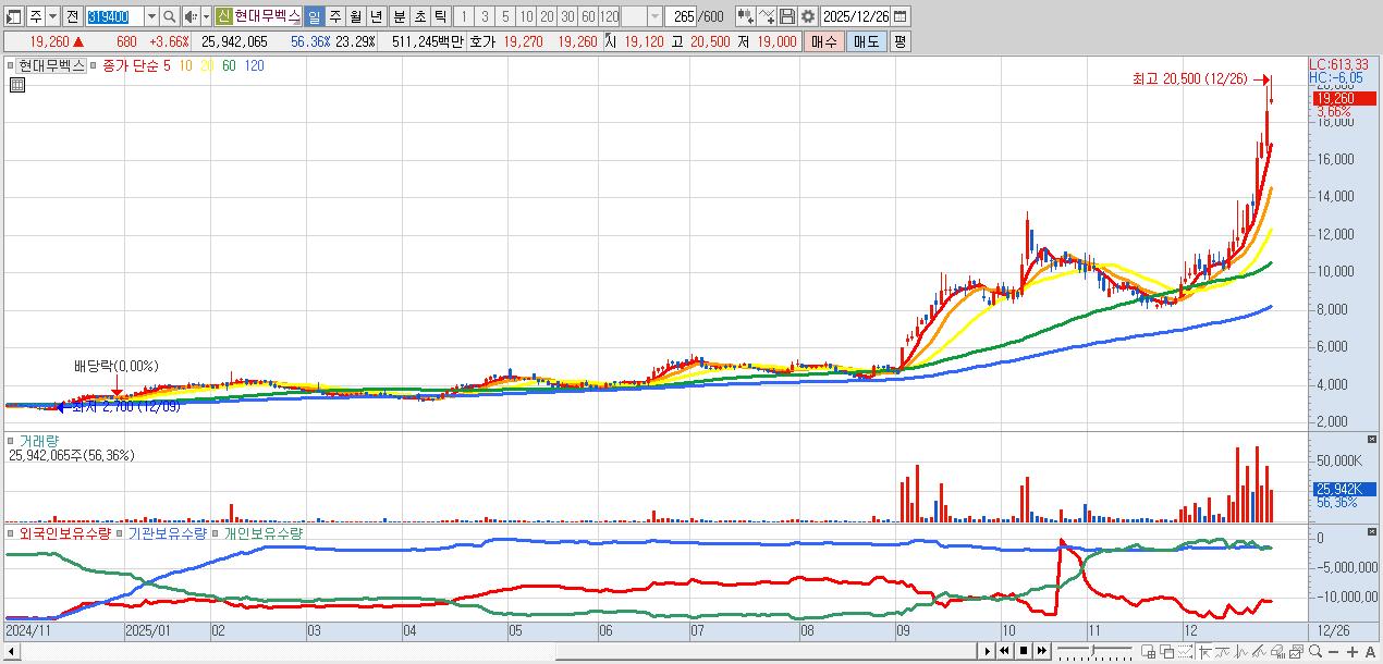 - 현대무벡스 (19,260원 ▲ 3.66% , 시총: 21,451억, 거래량: 25,942,065, 거래대금:5,112억)