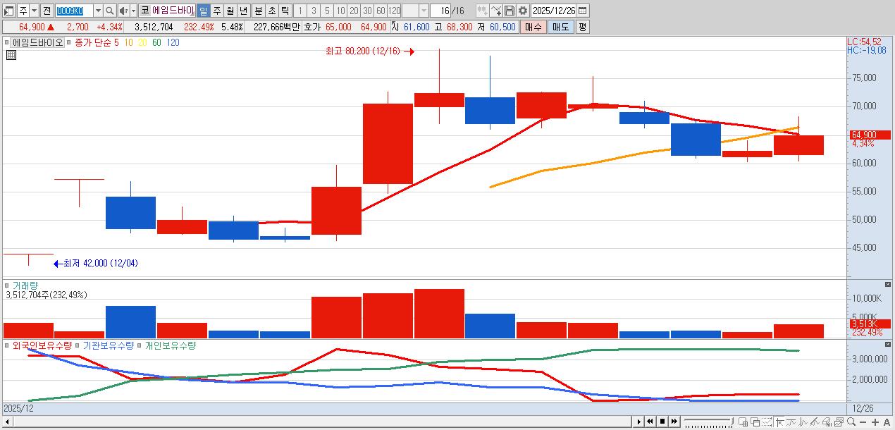 - 에임드바이오 (64,900원 ▲ 4.34% , 시총: 41,637억, 거래량: 3,512,704, 거래대금:2,277억)