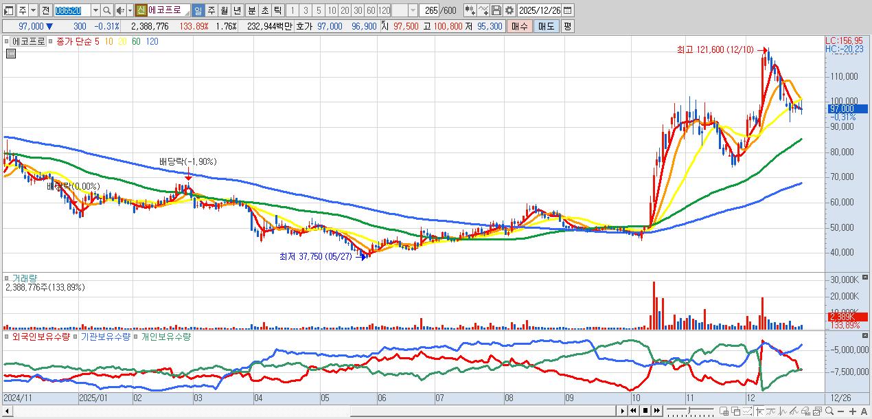 - 에코프로 (97,000원 ▼ -0.31% , 시총: 131,703억, 거래량: 2,388,776, 거래대금:2,329억)