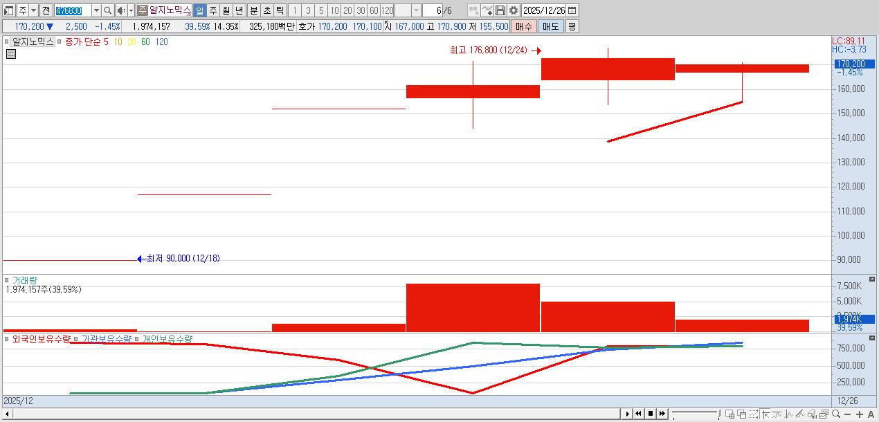 - 알지노믹스 (170,200원 ▼ -1.45% , 시총: 23,413억, 거래량: 1,974,157, 거래대금:3,252억)