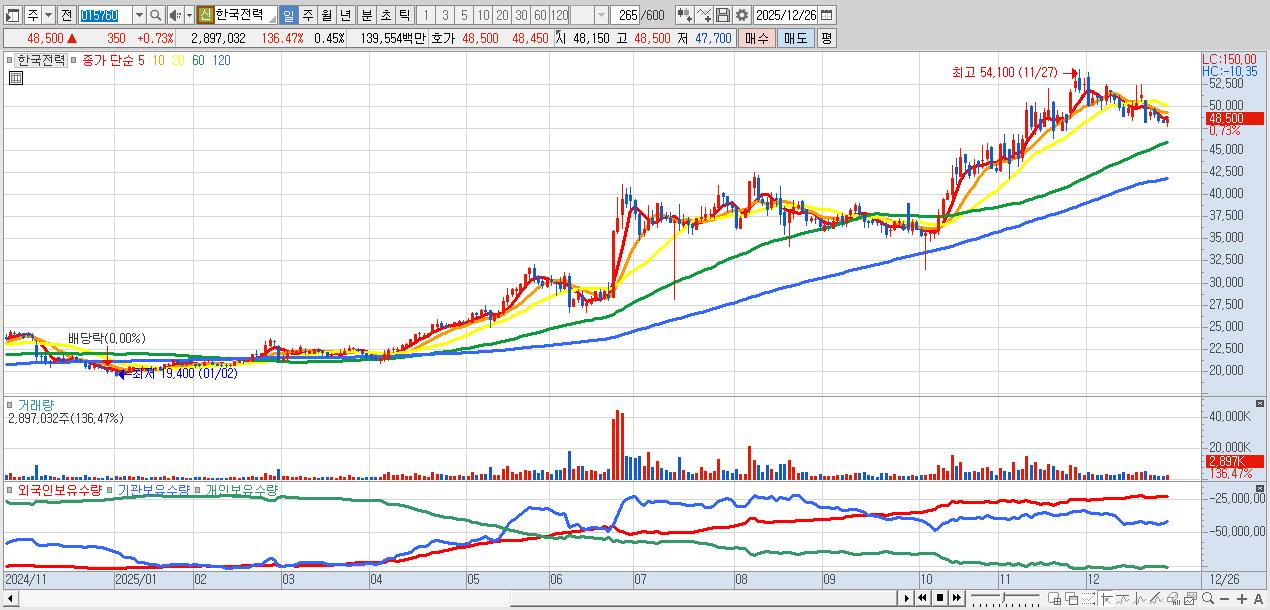 - 한국전력 (48,500원 ▲ 0.73% , 시총: 311,353억, 거래량: 2,897,032, 거래대금:1,396억)