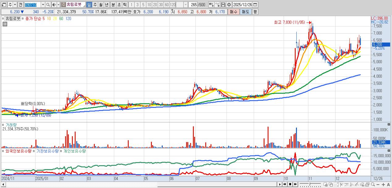 - 휴림로봇 (6,200원 ▼ -5.2% , 시총: 7,406억, 거래량: 21,334,379, 거래대금:1,374억)