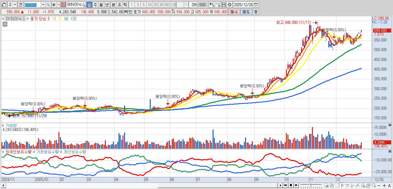 - SK하이닉스 (599,000원 ▲ 1.87% , 시총: 4,360,734억, 거래량: 4,243,548, 거래대금:25,427억)