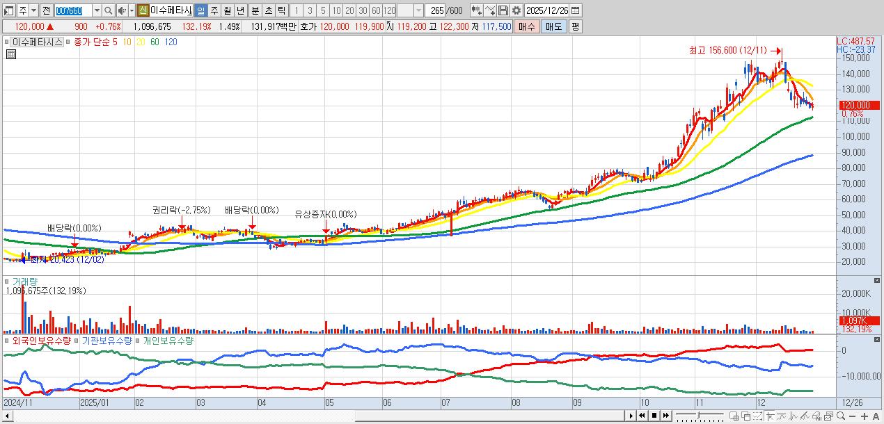 - 이수페타시스 (120,000원 ▲ 0.76% , 시총: 88,091억, 거래량: 1,096,675, 거래대금:1,319억)