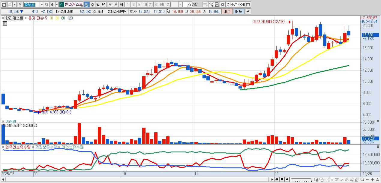 - 한라캐스트 (18,320원 ▼ -2.19% , 시총: 6,687억, 거래량: 12,281,501, 거래대금:2,363억)