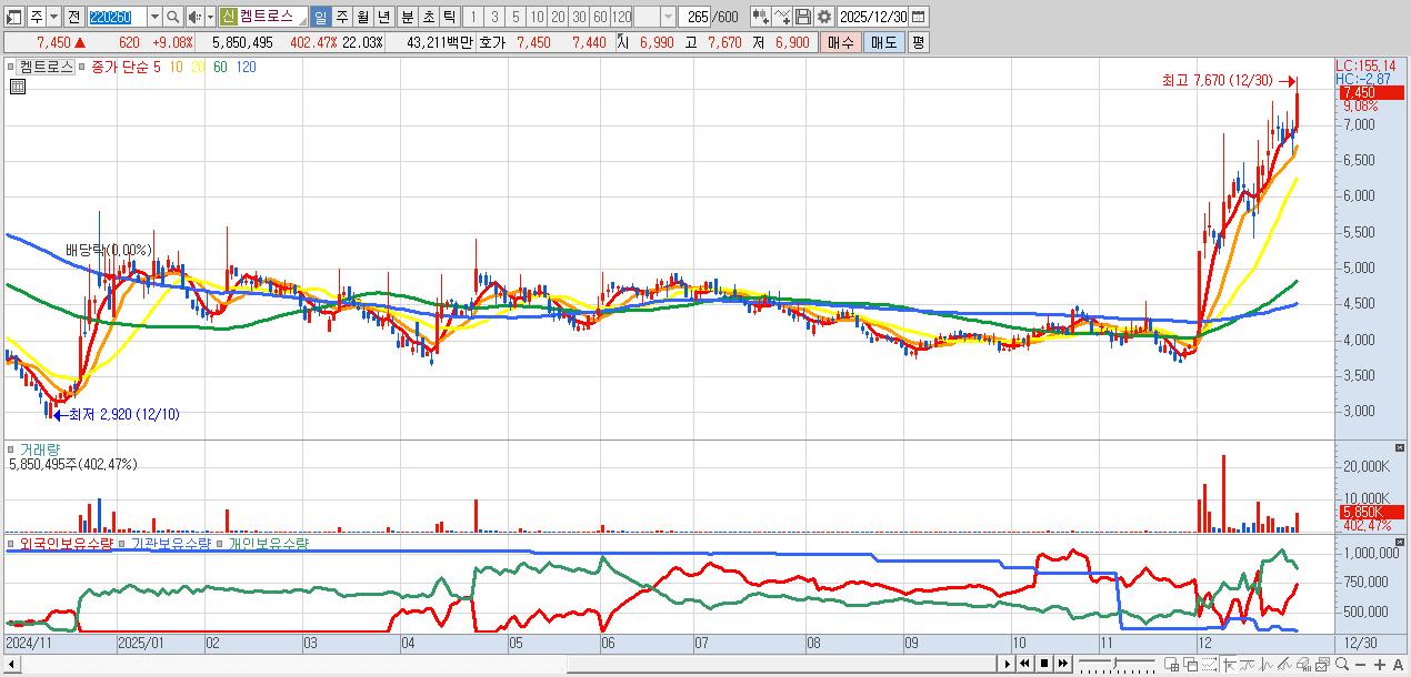 - 켐트로스 (7,450원 ▲ 9.08% , 시총: 1,979억, 거래량: 5,850,495, 거래대금:432억, KOSDAQ)