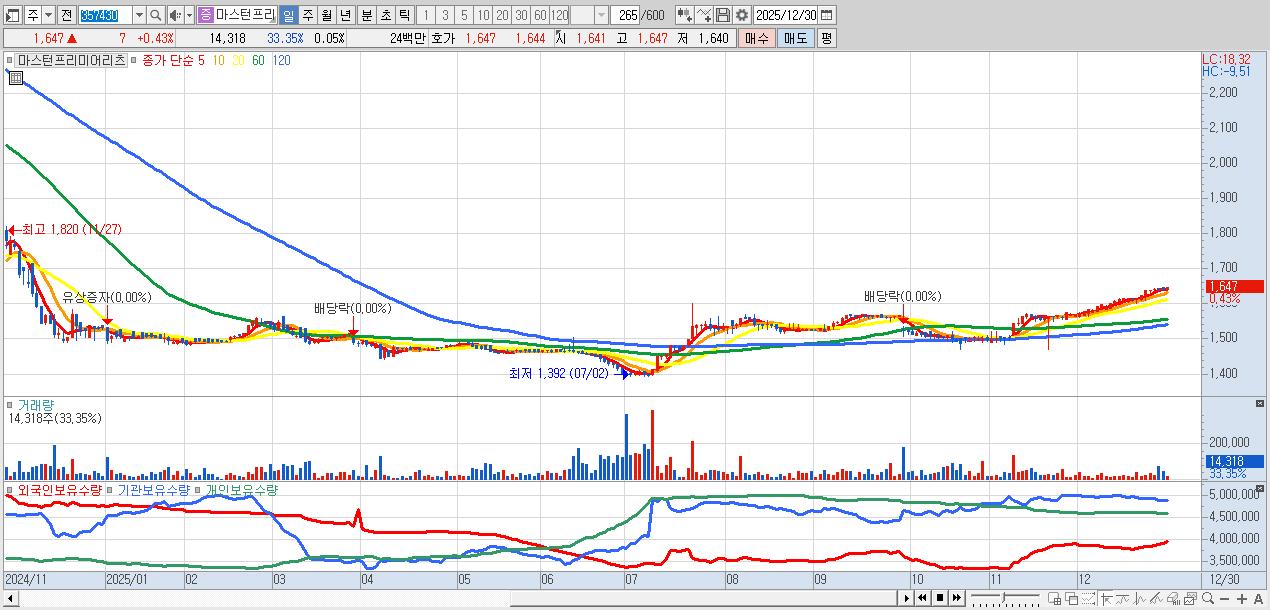 - 마스턴프리미어리츠 (1,647원 ▲ 0.43% , 시총: 502억, 거래량: 14,318, 거래대금:0억, KOSPI)