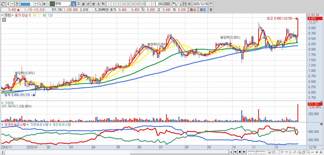 - 무학 (9,450원 ▲ 13.31% , 시총: 2,693억, 거래량: 571,741, 거래대금:53억, KOSPI)