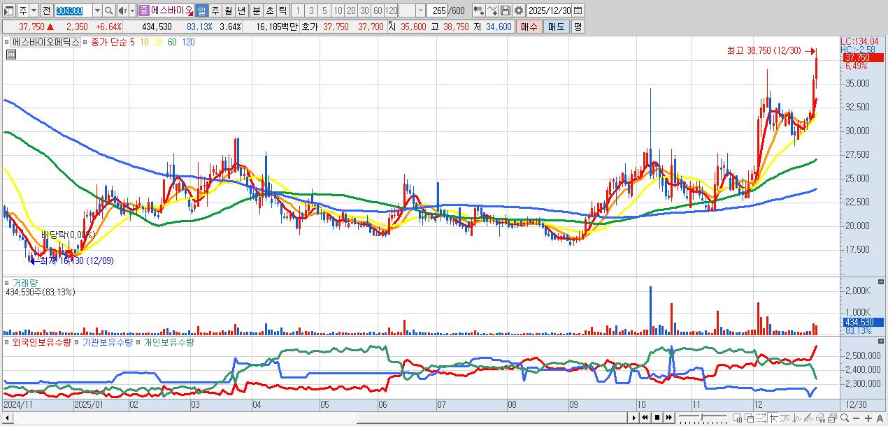 - 에스바이오메딕스 (37,950원 ▲ 7.2% , 시총: 4,535억, 거래량: 251,317, 거래대금:94억, KOSDAQ)