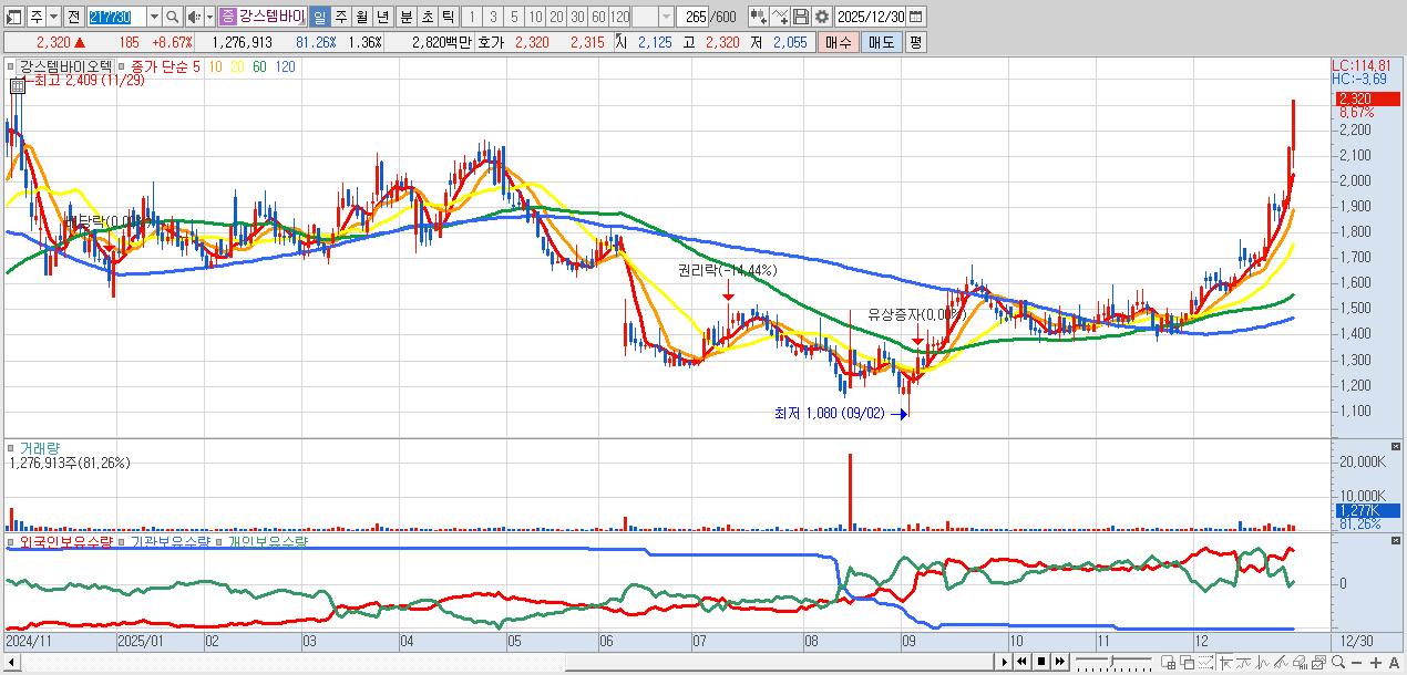 - 강스템바이오텍 (2,320원 ▲ 8.67% , 시총: 2,182억, 거래량: 1,276,913, 거래대금:28억, KOSDAQ)