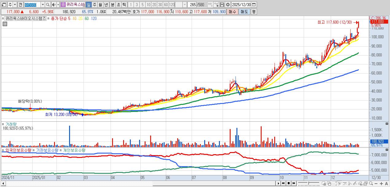 - 큐리옥스바이오시스템즈 (117,000원 ▲ 5.98% , 시총: 20,030억, 거래량: 180,920, 거래대금:205억, KOSDAQ)