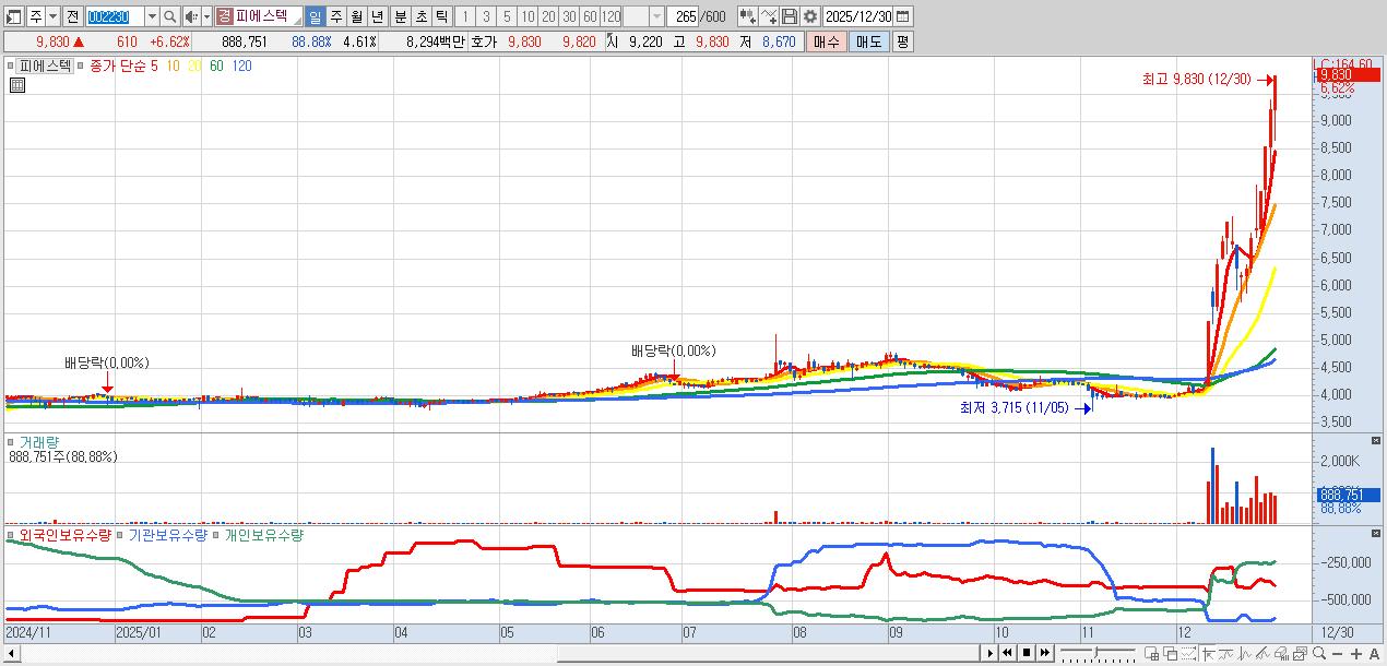 - 피에스텍 (9,830원 ▲ 6.62% , 시총: 1,895억, 거래량: 888,751, 거래대금:83억, KOSDAQ)