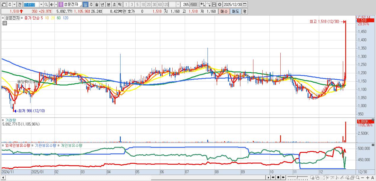 - 성문전자 (1,518원 ▲ 29.97% , 시총: 341억, 거래량: 5,892,771, 거래대금:84억, KOSPI)