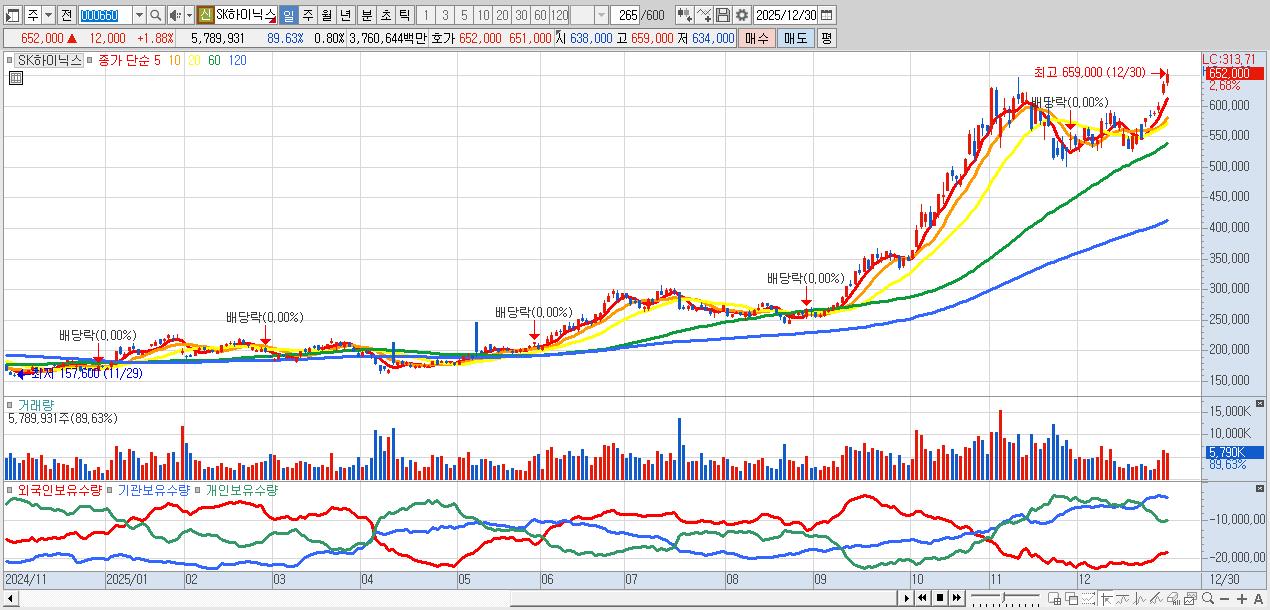 - SK하이닉스 (651,000원 ▲ 1.72% , 시총: 4,739,295억, 거래량: 4,094,603, 거래대금:26,625억, KOSPI)