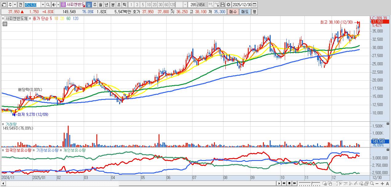 - 사피엔반도체 (38,100원 ▲ 5.25% , 시총: 3,131억, 거래량: 85,817, 거래대금:32억, KOSDAQ)