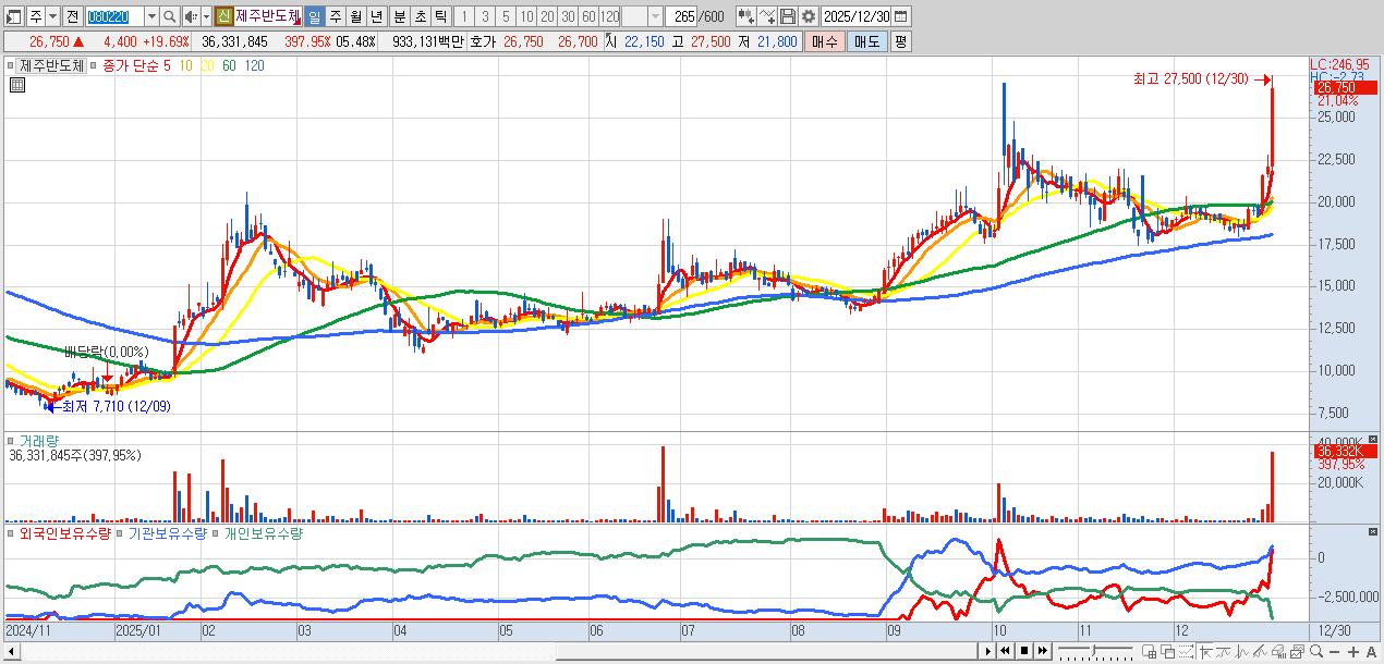 - 제주반도체 (26,350원 ▲ 17.9% , 시총: 9,076억, 거래량: 22,362,142, 거래대금:5,751억, KOSDAQ)